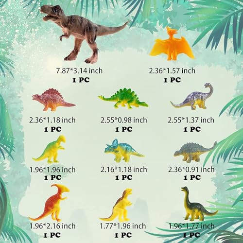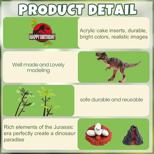 - Variété complète : 11 dinosaures, 11 arbres, 10 herbes, 3 œufs, 1 nid, 2 clôtures, 1 volcan et 1 décoration « Happy Birthday ».